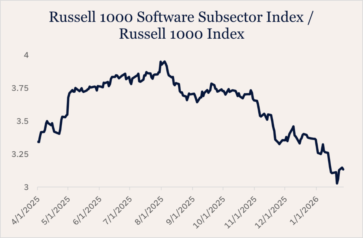 As AI tools continue to improve, concerns have grown that software as a service (SaaS) customers will be less interested in legacy offerings and instead leverage newfound AI capabilities in their place. Why do I need to pay for software, the thinking goes, if internal development of these systems now takes developers less time with AI? Furthermore, with the release of offerings like Anthropic’s Claude Cowork, an application with access to read and edit files, less technical users are now empowered to replace existing workflows. These concerns have worsened recently, and AI enthusiasm has spurred semiconductor stocks higher, crowding out investments in software names. The result has been a large performance dispersion within the technology sector between the software and semiconductor industries.